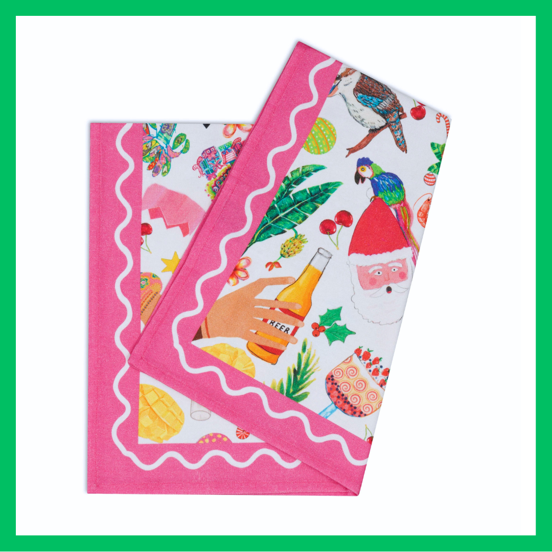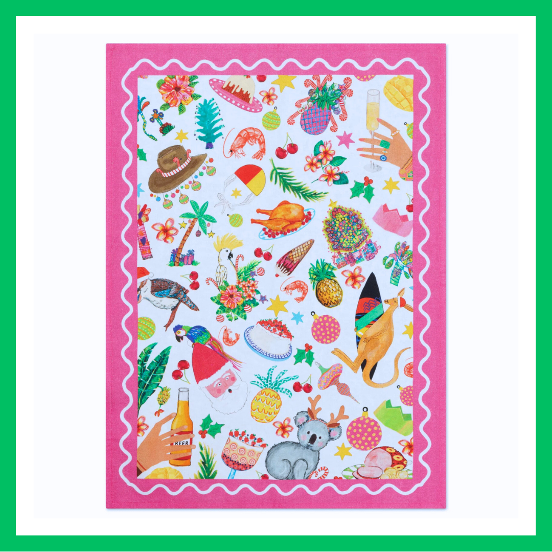 Because nothing says Christmas quite like prawns on the barbie, pavlova in the fridge, and a festive tea towel. Add a burst of Aussie cheer to your kitchen this silly season with The Great Aussie Dry Off Tea Towel — your trusty sidekick for Chrissie clean-ups and festive spills. Positively dripping in summer magic, this beauty is a visual love letter to the sounds, scents and scenes of Christmas Down Under.